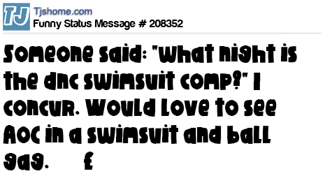 X is Someone said: "what night is the dnc swimsuit comp?" I concur. Would love to see AOC in a swimsuit and ball gag. 🤣