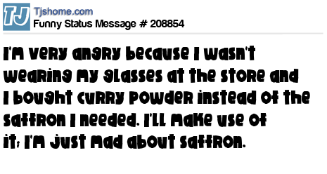 X says I'm very angry because I wasn't wearing my glasses at the store and I bought curry powder instead of the saffron I needed. I'll make use of it; I'm just mad about saffron.
