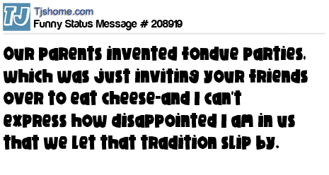 X is Our parents invented fondue parties, which was just inviting your friends over to eat cheese-and I can't express how disappointed I am in us that we let that tradition slip by.