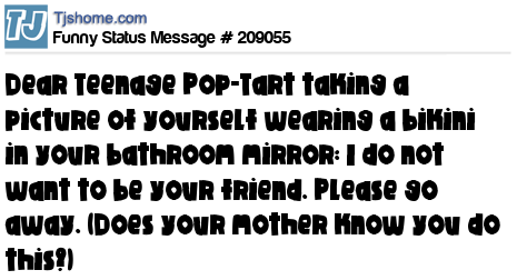 X says Dear Teenage Pop-Tart taking a picture of yourself wearing a bikini in your bathroom mirror: I do not want to be your friend. Please go away. (Does your mother know you do this?)