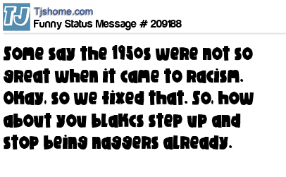 X says Some say the 1950s were not so great when it came to racism. Okay, so we fixed that. So, how about you blakcs step up and stop being naggers already.