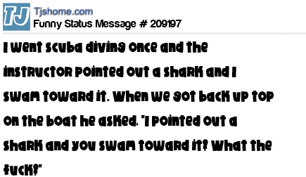 X is I went scuba diving once and the instructor pointed out a shark and I swam toward it. When we got back up top on the boat he asked, "I pointed out a shark and you swam toward it? What the fuck?"
