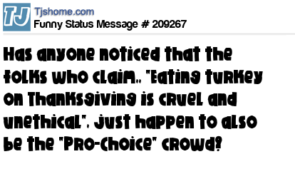 X says Has anyone noticed that the folks who claim,, "Eating turkey on Thanksgiving is cruel and unethical", just happen to also be the "Pro-Choice" crowd?
