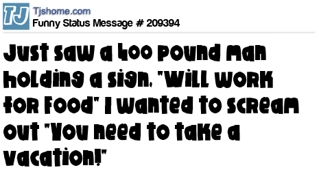 X is Just saw a 400 pound man holding a sign, "Will work for Food" I wanted to scream out "You need to take a vacation!"