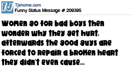 - # 120742 Women go for bad boys then wonder why they get hurt, afterwards the good guys are forced to repair a broken heart they didn't even cause