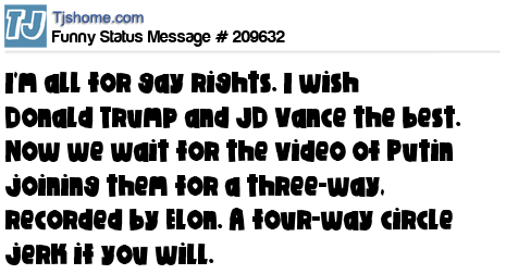 X is I'm all for gay rights. I wish Donald Trump and JD Vance the best. Now we wait for the video of Putin joining them for a three-way, recorded by Elon. A four-way circle jerk if you will.