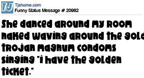 X is she danced around my room naked waving around the gold trojan magnum condoms singing "i have the golden ticket."