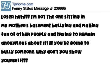 X is Loser huh??? I'm not the one sitting in my mother's basement bullying and making fun of other people and trying to remain anonymous about it! If you're going to bully someone, why don't you show yourself???