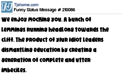 - # 210100 We enjoy mocking you. A bunch of lemmings running headlong towards the cliff. The product of your idiot leaders dismantling education by creating a generation of complete and utter imbeciles.