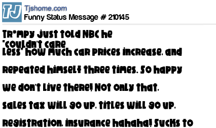 - # 210144 Dummy just told NBC he "couldn't care less" how much car prices increase, and repeated himself three times. So happy we don't live there! Not only that, sales tax will go up, titles will go up, registration, insurance hahaha! Sucks to be "ya'll" lol