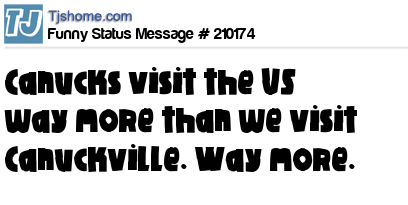 - # 210180 Canucks visit the US way more than you visit Canuckville? Way more? AWESOME!!! That makes us want to visit Canada even more! Thanks for that information!!! 😂
