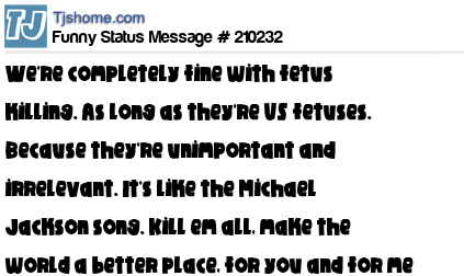 X is We're completely fine with fetus killing. As long as they're US fetuses. Because they're unimportant and irrelevant. It's like the Michael Jackson song. Kill em all, make the world a better place, for you and for me and the entire human race 🎵
