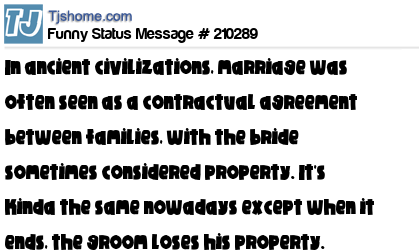 X says In ancient civilizations, marriage was often seen as a contractual agreement between families, with the bride sometimes considered property. It's kinda the same nowadays except when it ends, the groom loses his property.