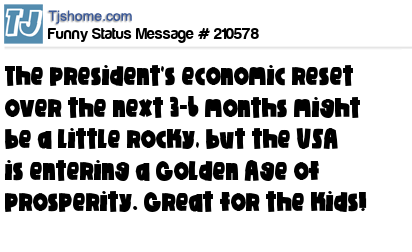 - # 210586 "The president's economic reset over the next 3-6 months might be a little rocky...." A little? BAWAHAHAHAHAHAHA!!!!!!