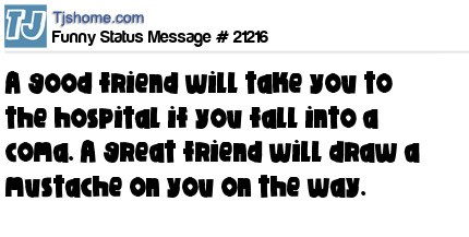 X A good friend will take you to the hospital if you fall into a coma. A great friend will draw a mustache on you on the way.