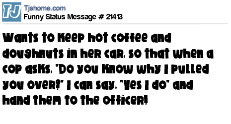 - # 27234 discovered today that when a police officer says, "Ma'am, your eyes look red. Have you been drinking?", you should never respond with "Officer, your eyes look glazed. Have you been eating doughnuts?"