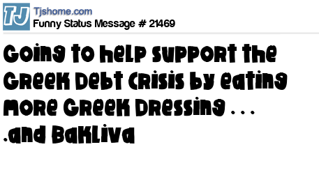 X is going to help support the Greek Debt Crisis by eating more Greek Dressing . . . .and Bakliva