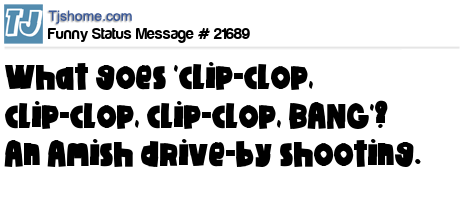 X says What goes 'clip-clop, clip-clop, clip-clop, BANG'? An Amish drive-by shooting.