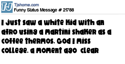 X is i just saw a white kid with an afro using a martini shaker as a coffee thermos. God I miss college. a moment ago clear