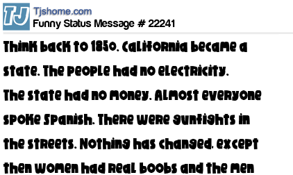 X says Think back to 1850. California became a state. The people had no electricity. The state had no money. Almost everyone spoke Spanish. There were gunfights in the streets. Nothing has changed, except then women had real boobs and the men didn't hold hands!