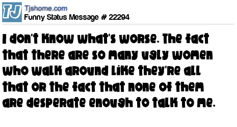 X is I don't know what's worse. The fact that there are so many ugly women who walk around like they're all that or the fact that none of them are desperate enough to talk to me.