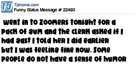 X is went in to Zoomers tonight for a pack of gum and the clerk asked if I had gas? I told her I did earlier but I was feeling fine now. Some people do not have a sense of humor