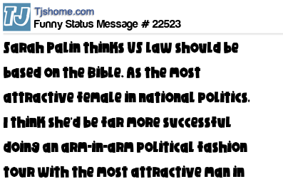 X Sarah Palin thinks US law should be based on the Bible. As the most attractive female in national politics, I think she'd be far more successful doing an arm-in-arm political fashion tour with the most attractive man in Washington, Ann Coulter.