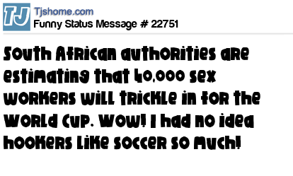 X South African authorities are estimating that 40,000 sex workers will trickle in for the World Cup. Wow! I had no idea hookers like soccer so much!