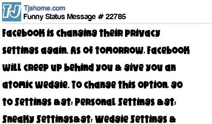 X Facebook is changing their privacy settings again. As of tomorrow, Facebook will creep up behind you & give you an atomic wedgie. To change this option, go to Settings > Personal Settings > Sneaky Settings> Wedgie Settings & uncheck the Shenaniga