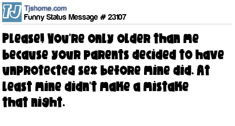 X Please! You're only older than me because your parents decided to have unprotected sex before mine did. At least mine didn't make a mistake that night.