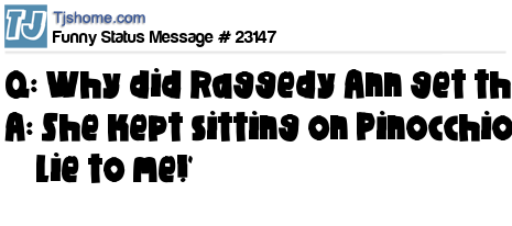 X is Q: Why did Raggedy Ann get thrown out of the toy box? A: She kept sitting on Pinocchio's face, and moaning, ⠀˜Lie to me!'