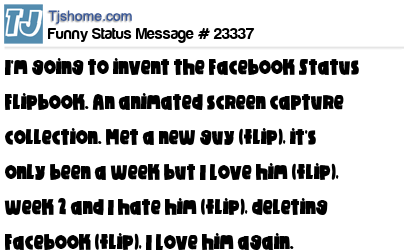 X I'm going to invent the Facebook Status Flipbook. An animated screen capture collection. Met a new guy (flip), it's only been a week but I Love him (flip), week 2 and I hate him (flip), deleting Facebook (flip), I Love him again.