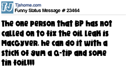 X The one person that BP has not called on to fix the oil leak is MacGyver. he can do it with a stick of gum a Q-tip and some tin foil!!!
