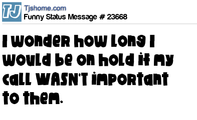 - # 190449 Every time I'm put on hold for longer then 10 minutes and a recorded message says "Your call is very important to us!" I cant help but wonder how long I'd have to wait if it wasn't very important?