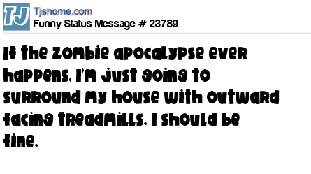 - # 51429 when the Zombie Apacalypse happens (and it will) I'm going to surround my house with outward facing treadmills. Yep, I'll be just fine.