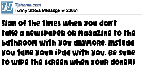X Sign of the times when you don't take a newspaper or magazine to the bathroom with you anymore. Instead you take your iPad with you. Be sure to wipe the screen when your done!!!
