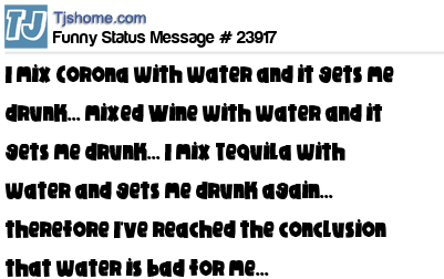 X I mix Corona with water and it gets me drunk... mixed Wine with water and it gets me drunk... I mix Tequila with water and gets me drunk again... therefore I've reached the conclusion that water is bad for me...