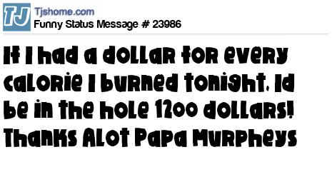 X If I had a dollar for every calorie I burned tonight, Id be in the hole 1200 dollars! Thanks Alot Papa Murpheys