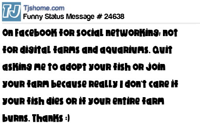 X is on Facebook for social networking; not for digital farms and aquariums. Quit asking me to adopt your fish or join your farm because really I don't care if your fish dies or if your entire farm burns. Thanks :)