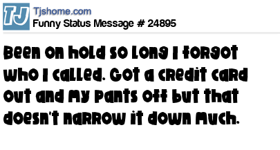 - # 19020 I've been on hold so long I can't remember who I called. I have a credit card out & my pants off but that doesn't narrow it down much.