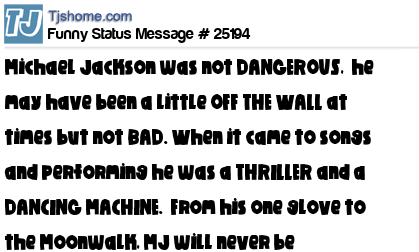 X Michael Jackson was not DANGEROUS, he may have been a little OFF THE WALL at times but not BAD. When it came to songs and performing he was a THRILLER and a DANCING MACHINE. From his one glove to the Moonwalk, MJ will never be forgotten!