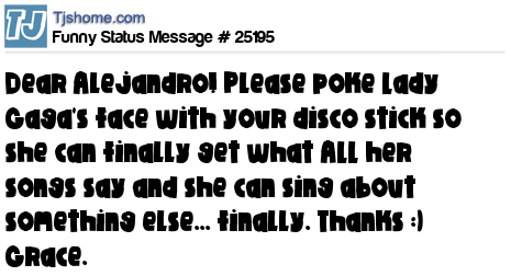 X is Dear Alejandro! Please poke Lady Gaga's face with your disco stick so she can finally get what ALL her songs say and she can sing about something else... finally. Thanks :) Grace.