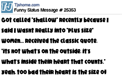 X Got called "shallow" recently because I said I wasnt really into "plus size" women... received the classic quote, "its not what's on the outside, it's what's inside their heart that counts." yeah, too bad their heart is the size of a Canned Ham.