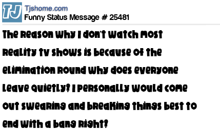 X the reason why I don't watch most reality tv shows is because of the elimination round why does everyone leave quietly? I personally would come out swearing and breaking things best to end with a bang right?