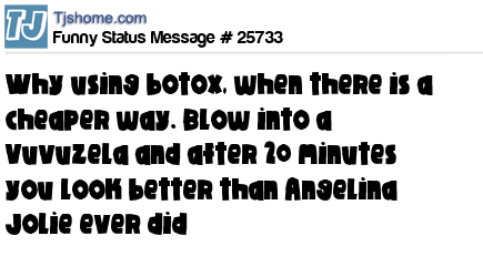 X says Why using botox, when there is a cheaper way. Blow into a Vuvuzela and after 20 minutes you look better than Angelina Jolie ever did
