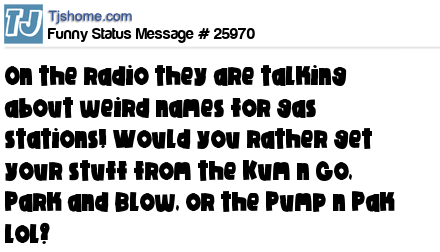 X is On the radio they are talking about weird names for gas stations! Would you rather get your stuff from the Kum n Go, Park and Blow, or the Pump n Pak lol?