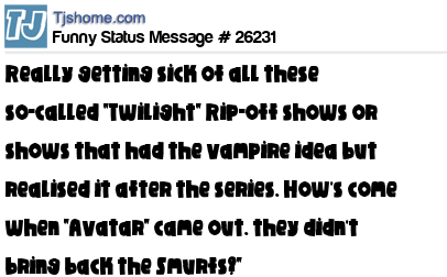 X is really getting sick of all these so-called "Twilight" Rip-off shows or shows that had the vampire idea but realised it after the series. How's come when "Avatar" came out. they didn't bring back the Smurfs?"