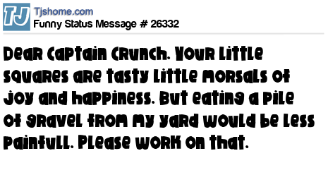 X Dear Captain Crunch. Your little squares are tasty little morsals of joy and happiness. But eating a pile of gravel from my yard would be less painfull. Please work on that.