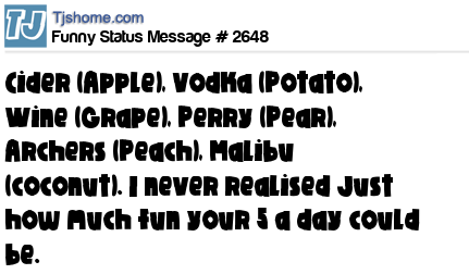 X says Cider (Apple), Vodka (Potato), Wine (Grape), Perry (Pear), Archers (Peach), Malibu (coconut). I never realised Just how much fun your 5 a day could be.