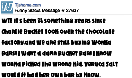 X says WTF It's been 25 something years since Charlie Bucket took over the Chocolate factory,and we are still buying Wonka Bars! I want a damn Bucket Bar! I know wonka picked the wrong kid. Veruca Salt would if had her own bar by know.